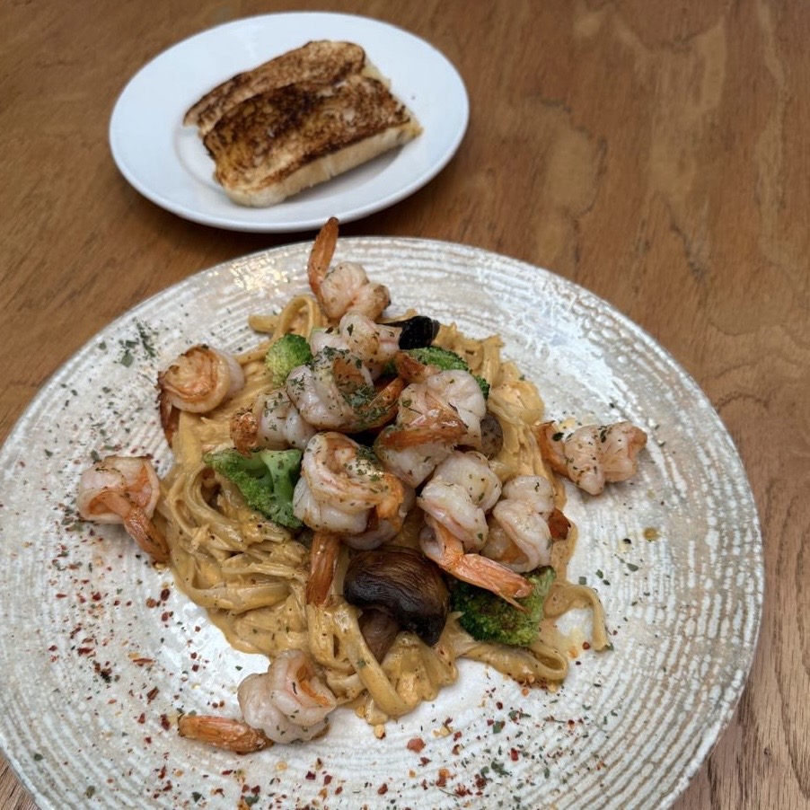 (495gr.) Pasta Fettuccine acompañada de nuestra receta especial de camarones bacanora y queso, mezclado con brócoli y champiñones