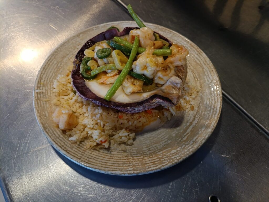 140 gr. Camarones salteados con cebolla, chile caribe y ejotes, acompañados de arroz.