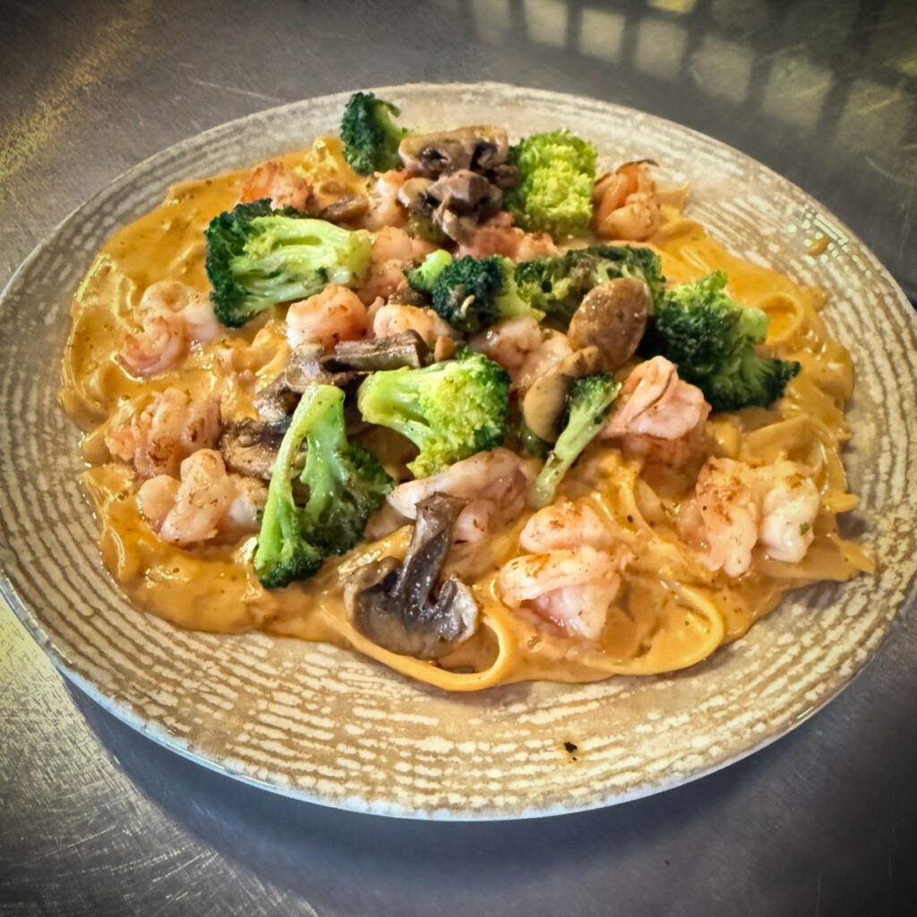 (495gr.) Pasta Fettuccine acompañada de nuestra receta especial de camarones bacanora y queso, mezclado con brócoli y champiñones