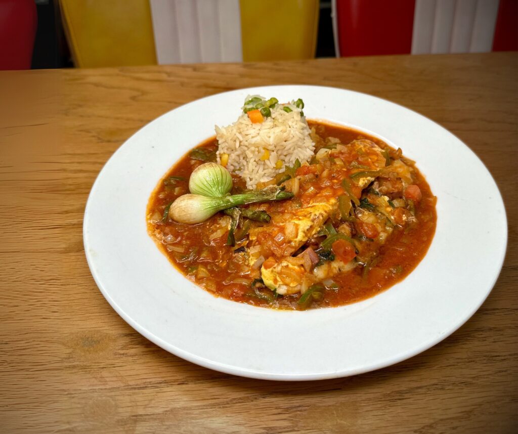 485 gr. Filete de pescado relleno de pulpo y queso, bañado en salsa de tomates y chiles, acompañado de cebolla cambray y arroz primavera