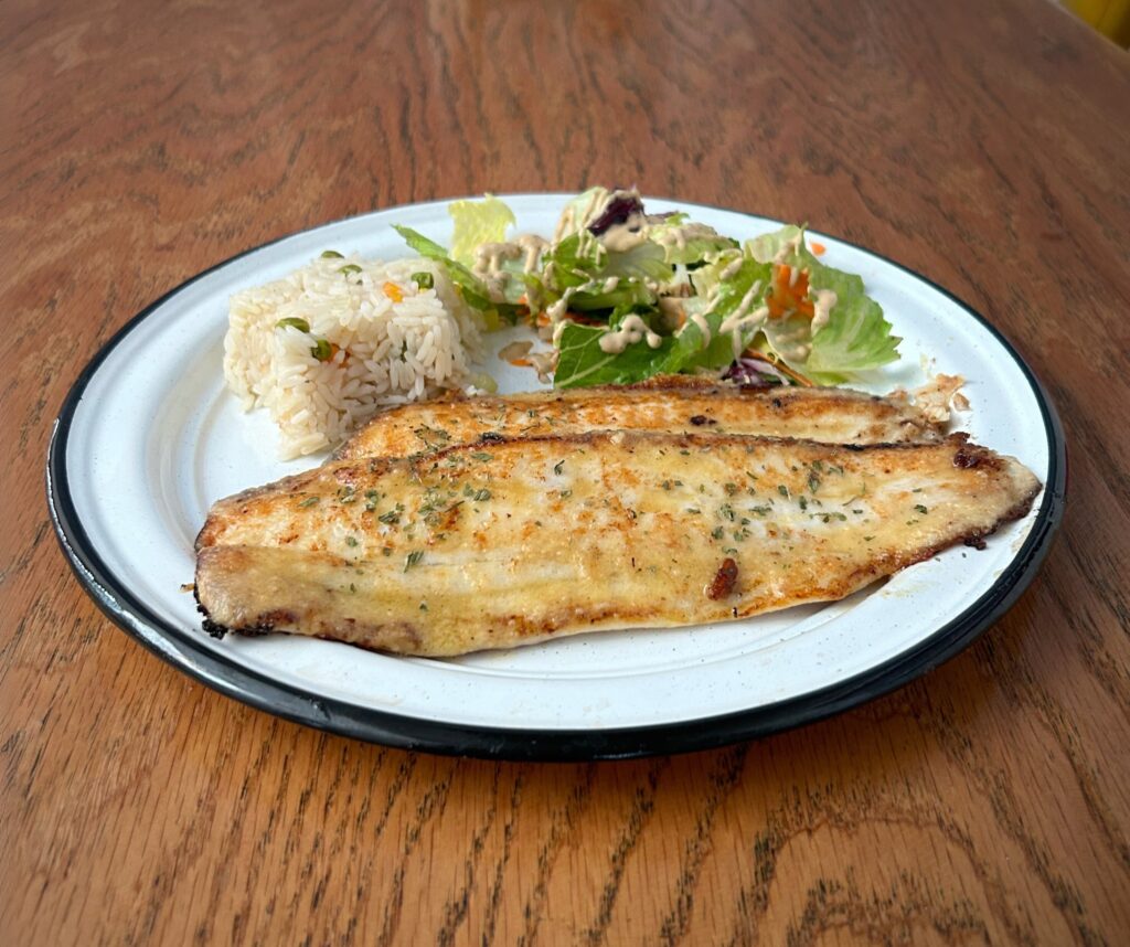 300 gr. Filete lenguado a la plancha con mojo de la casa, acompañado de arroz y ensalada.