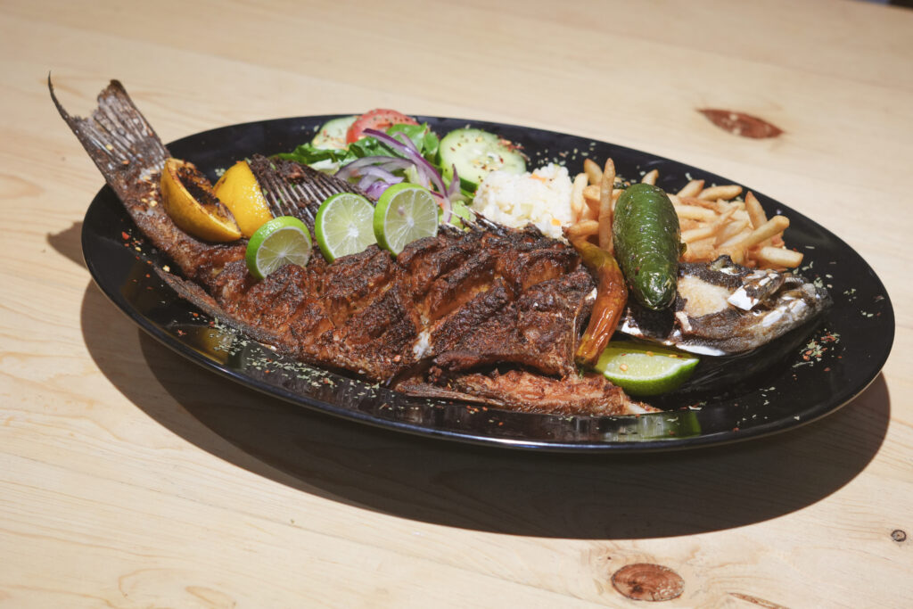 (1 kg). Crujiente filete de pescado frito, sazonado con un toque de especias, servido con una ensalada fresca, papas doradas, arroz primavera y tortillas de maíz (para 2-3 personas)